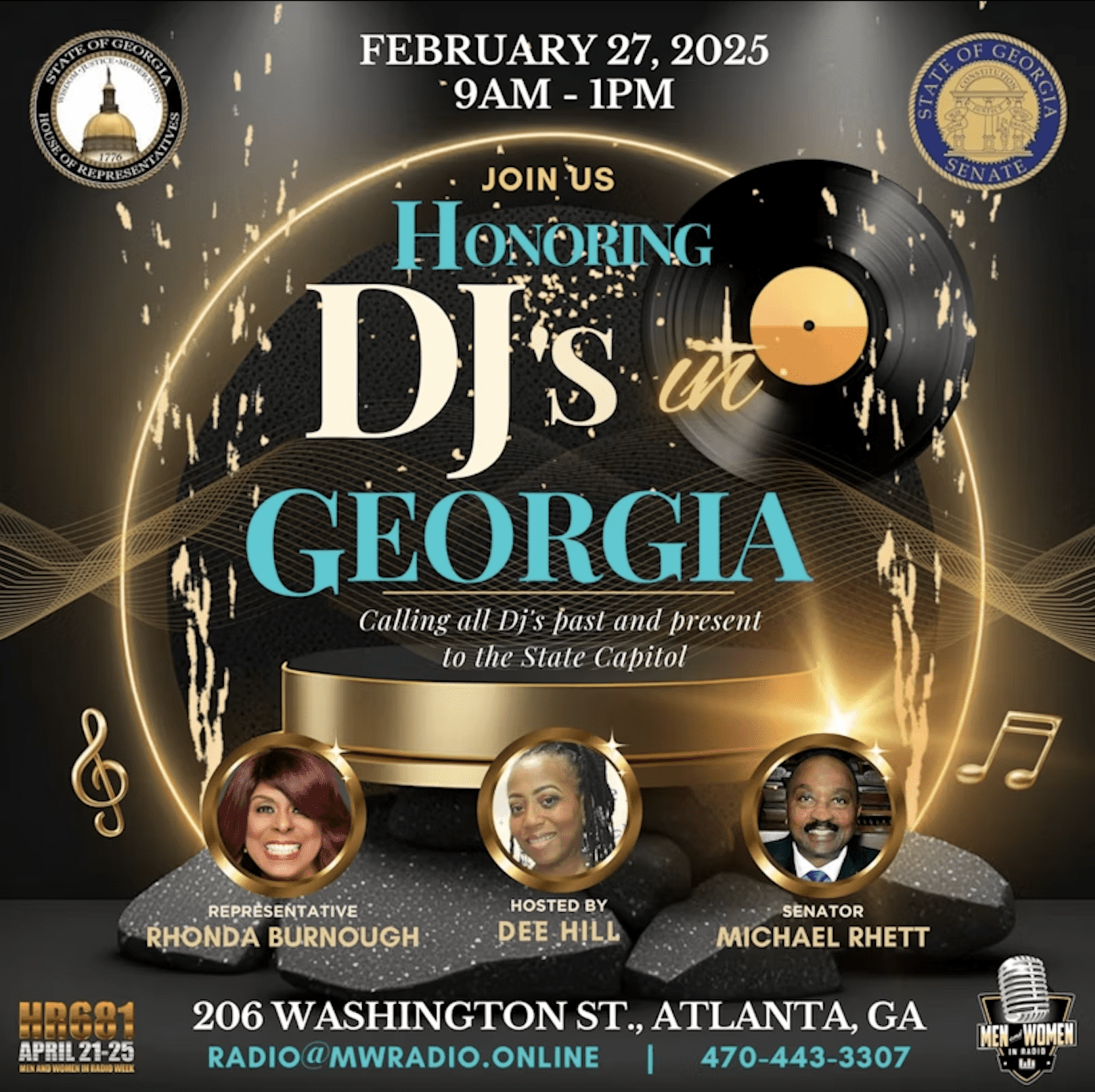 Mark your calendars for February 27, 2025, and join us from 9 AM to 1 PM at the Georgia State Capitol (206 Washington St, Atlanta, GA) for a special ceremony dedicated to honoring the legacy and influence of Georgia DJs, past and present.This event, hosted by Dee Hill, Senator Rhett, and Representative Rhonda Burnough, will highlight the contributions of radio pioneers, cultural curators, and DJs who have played a pivotal role in shaping the musical identity of Georgia and beyond.